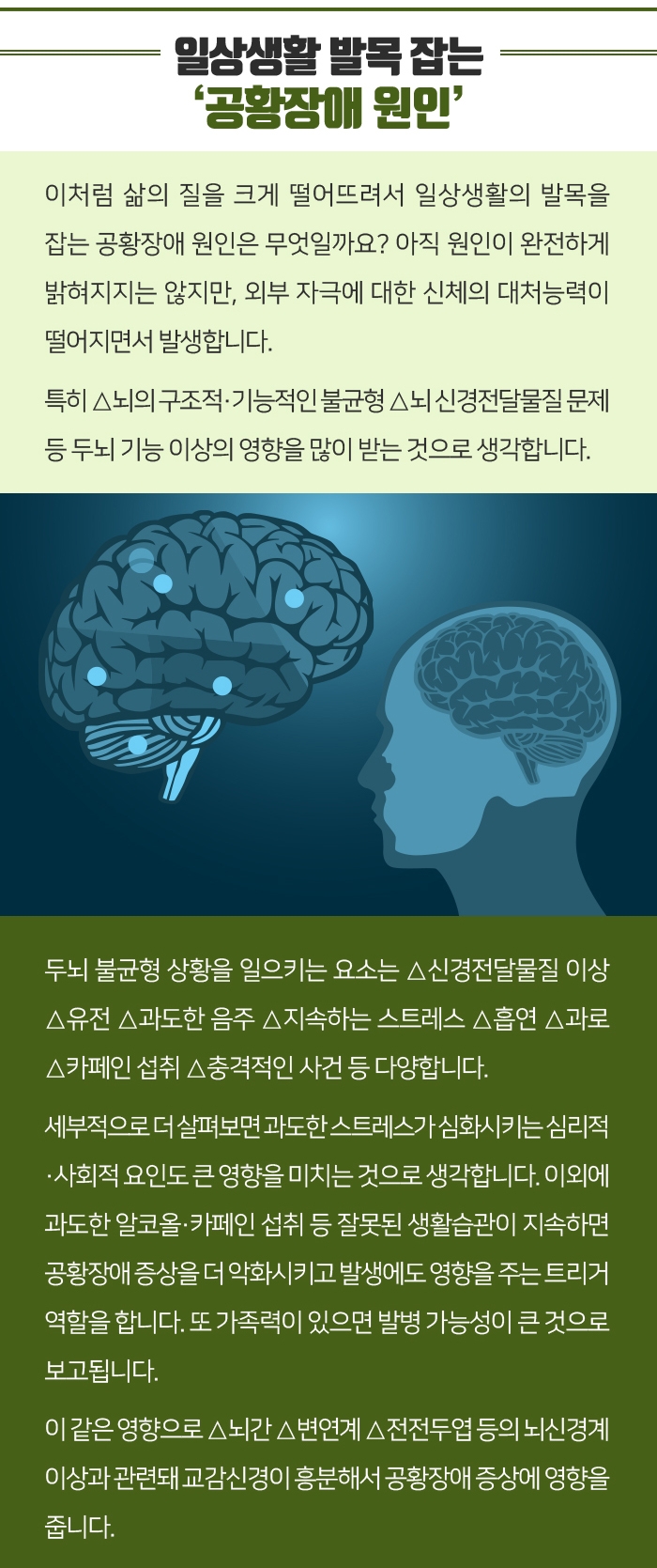 이 이미지는 공황장애의 원인과 관련된 다양한 요소를 설명하고 있어요.
