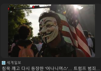 [2] Wikipedia - 어나니머스 (그룹) (https://ko.wikipedia.org/wiki/%EC%96%B4%EB%82%98%EB%8B%88%EB%A8%B8%EC%8A%A4_(%EA%B7%B8%EB%A3%B9))